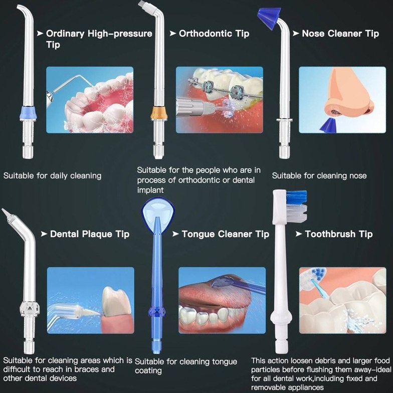 اقلام همراه این واترجت 1 2 سری مسواک 2 سری جت کلاسیک ( معمولی ) 1 سری ارتدونسی 1 سری پاک کننده زبان 1 سری پاک کننده بینی 1 سری مخصوص لثه ( سوزنی )